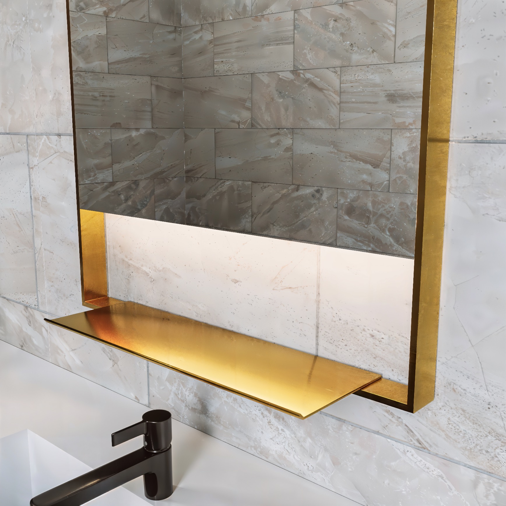Espejo a medida con marco metálico de 10x40mm, repisa y vidrio enrasado con luz ambiental superior e inferior